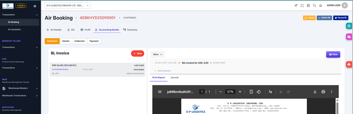 Click Submit → The system generates the invoice in Proforma