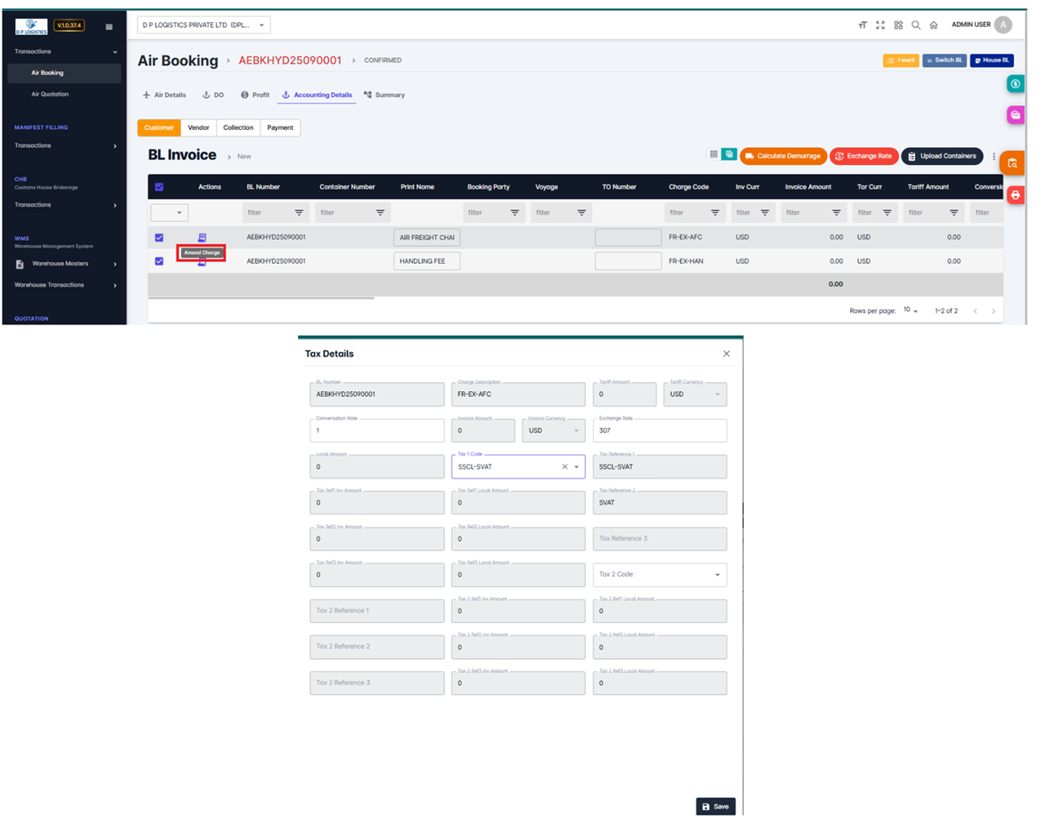 Click Amend Charges → Tax Breakdown Screen appears.