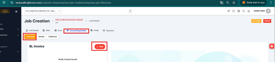 Click + Create New to begin the invoice creation process for the selected BL Number.
