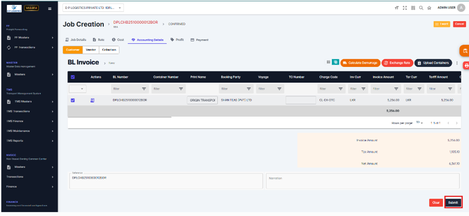 After submission, the system generates a unique Invoice Reference Number, available under the Accounting Details section.