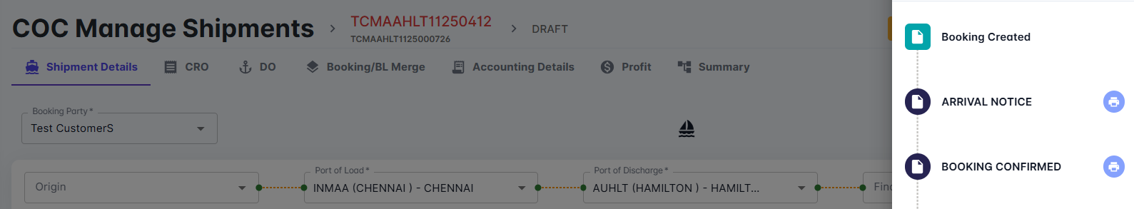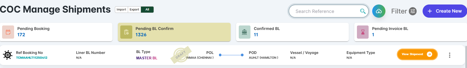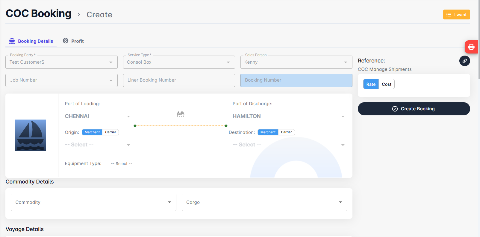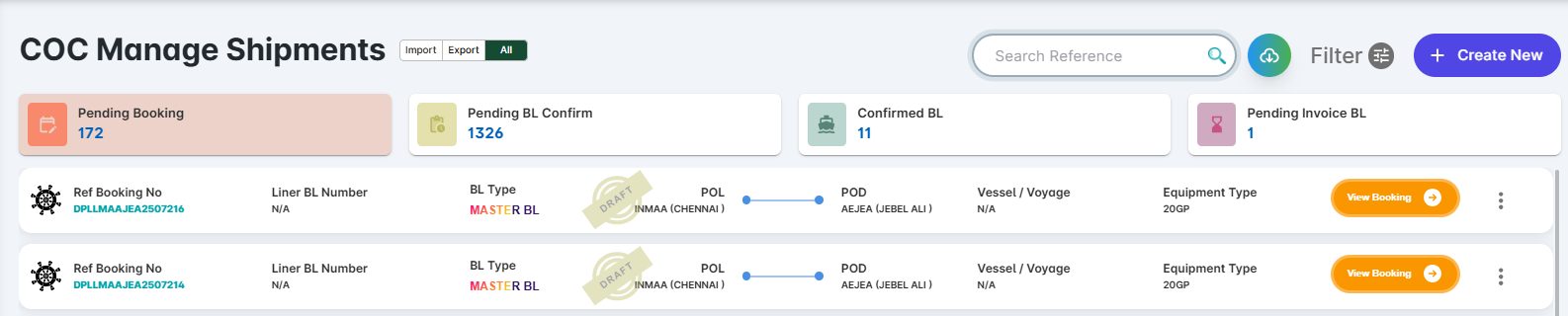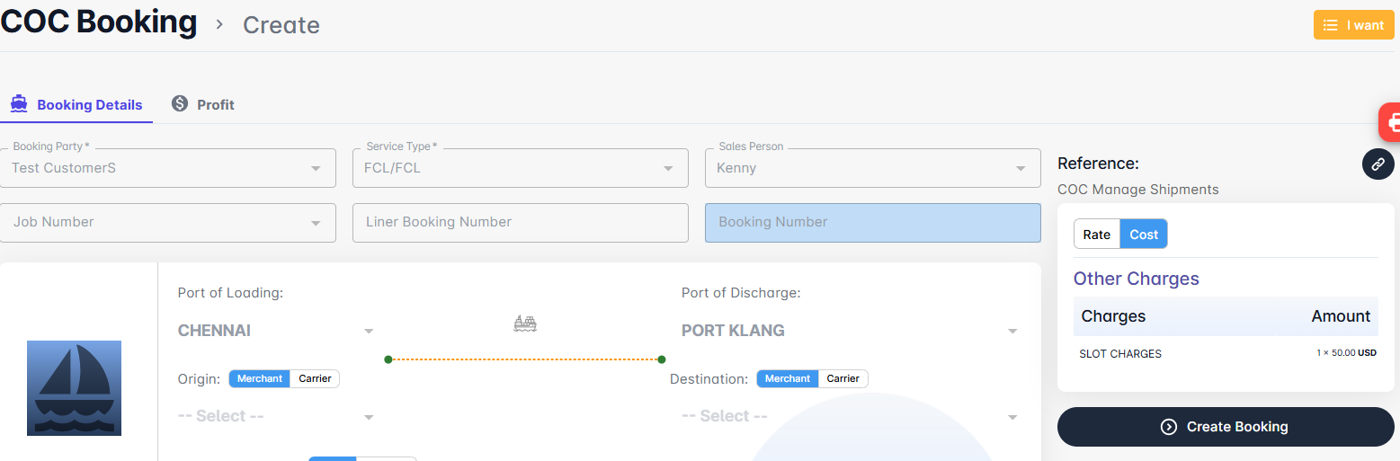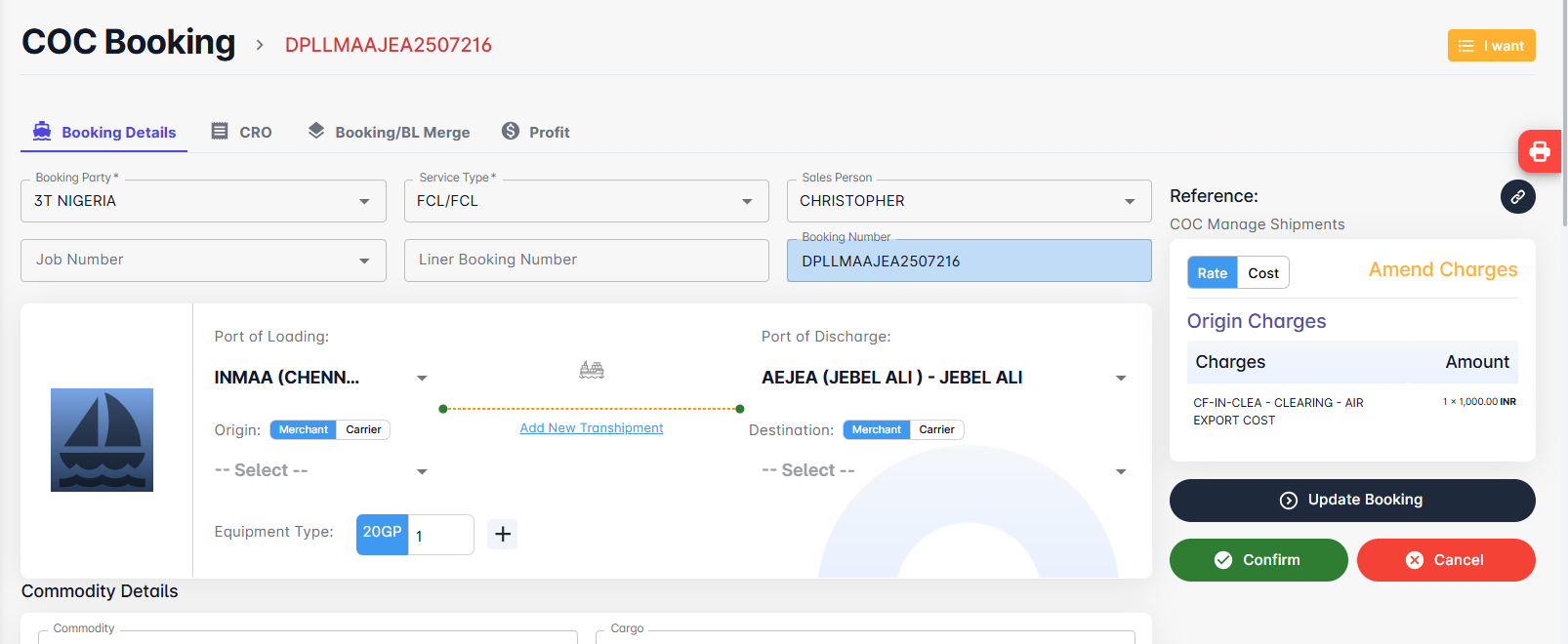 All relevant shipment, rate, cost, and voyage details are automatically fetched from the COC RR, ensuring accuracy and efficiency in the booking process. Users can review, update, and confirm bookings before proceeding to Bill of Lading (BL) confirmation.