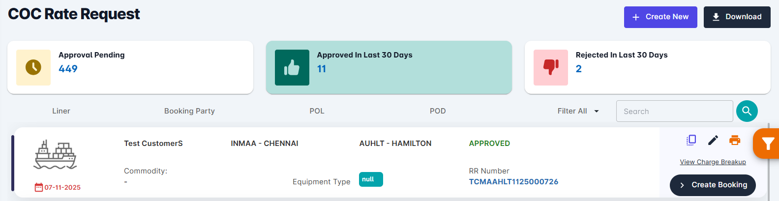 The COC Booking module in Zealit 2.0 allows users to seamlessly create a booking from an Approved COC Rate Request (RR).