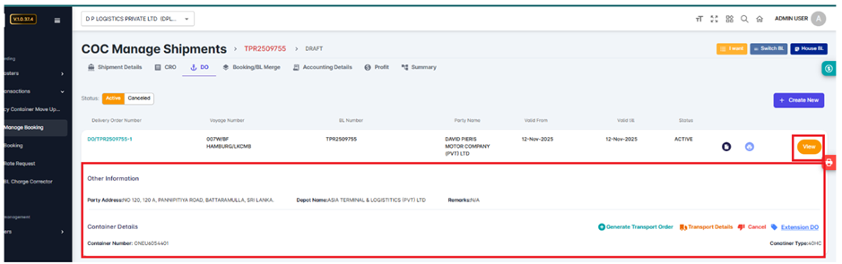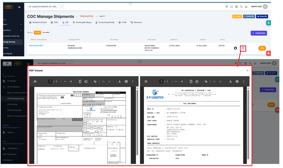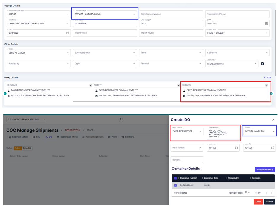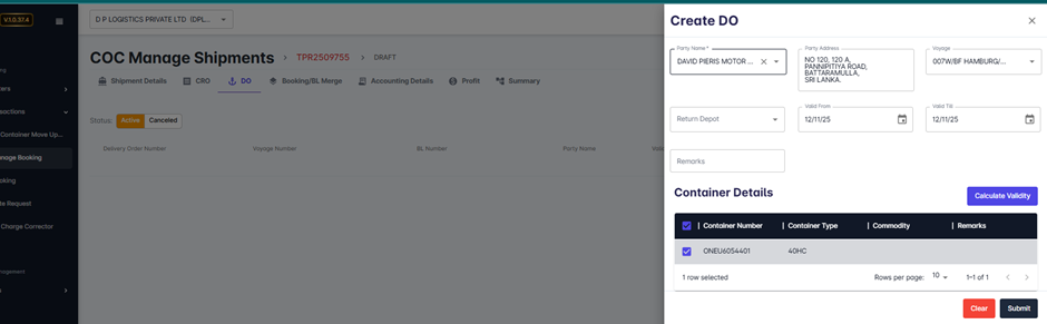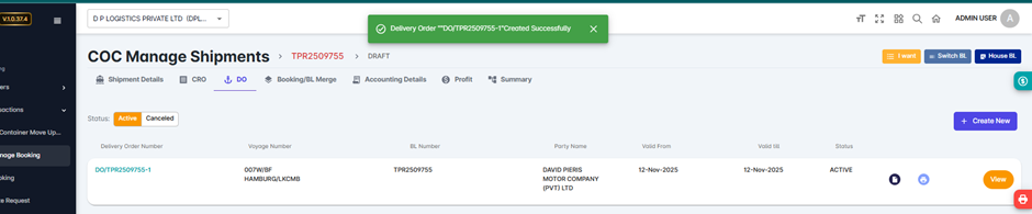 Once submitted, the DO record will be saved in the system and linked to the corresponding shipment.