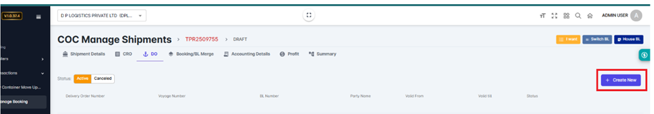 Click + CREATE NEW to initiate a new Delivery Order.