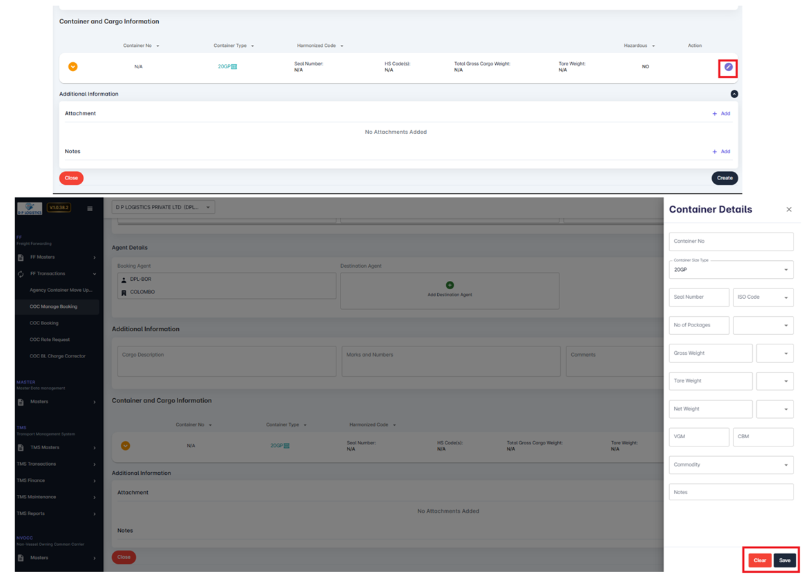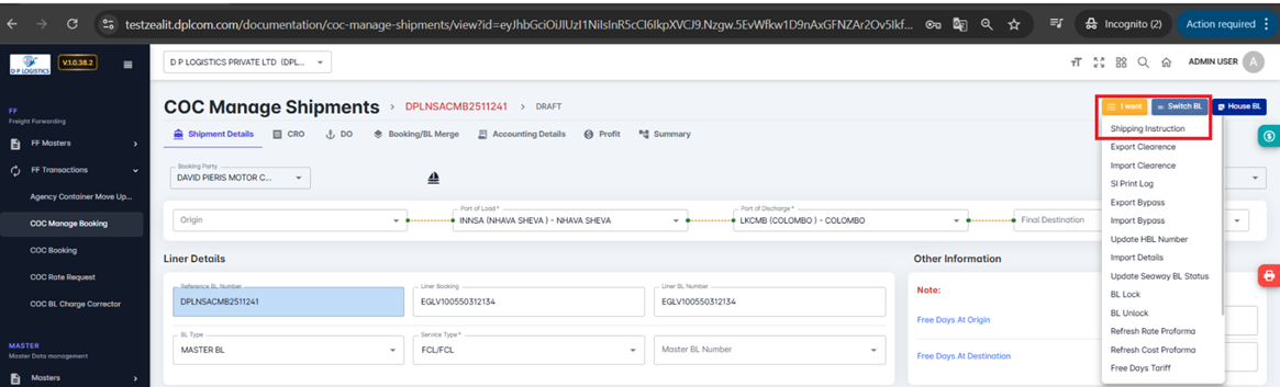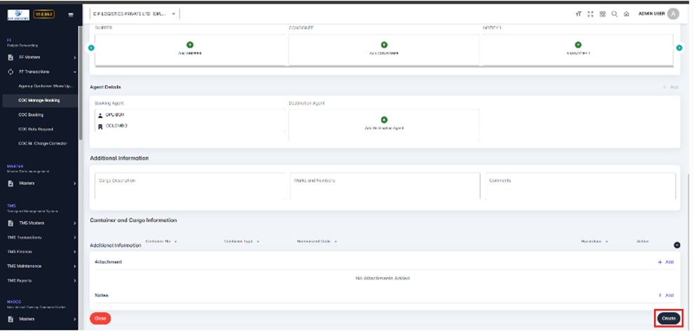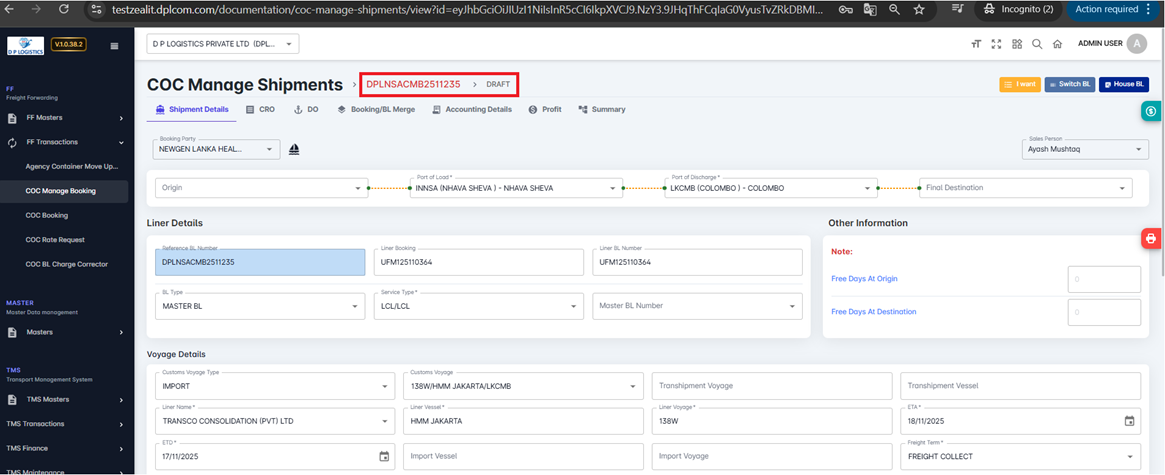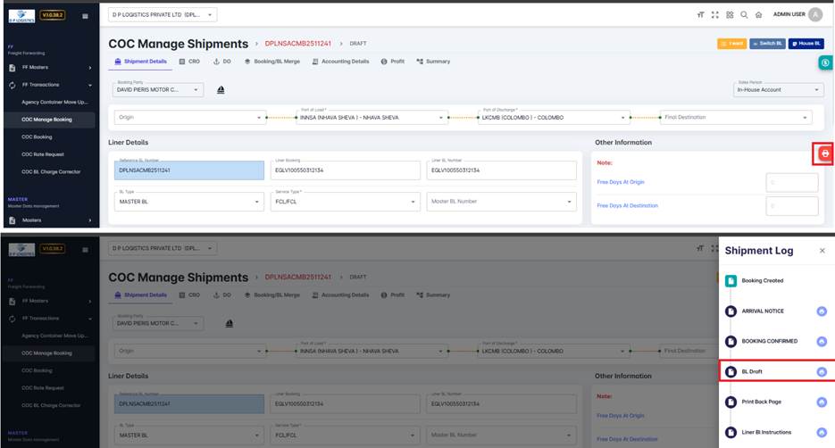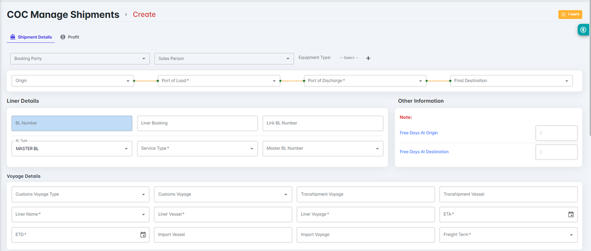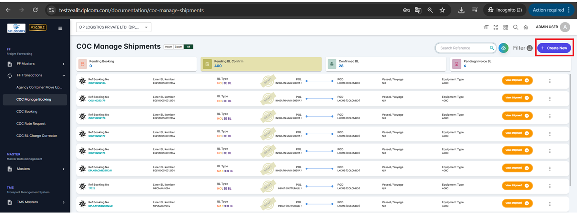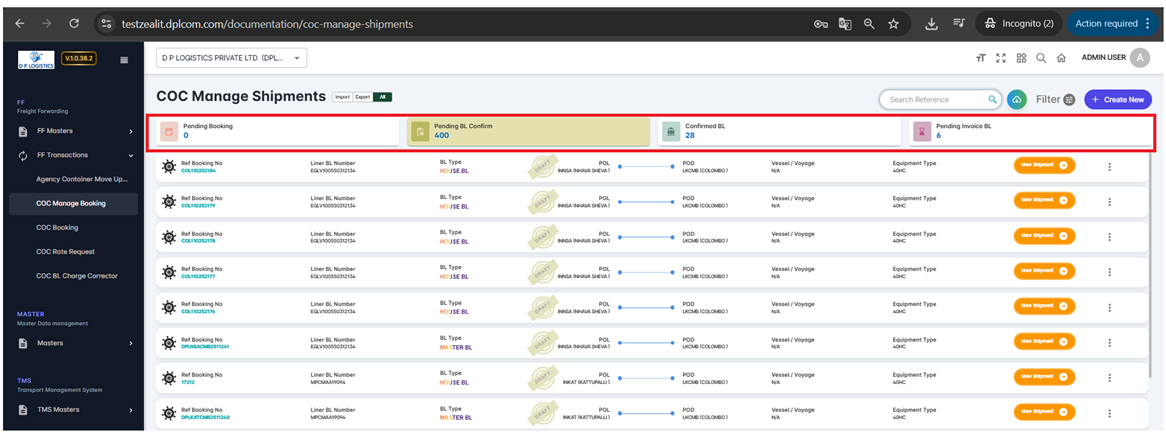 The COC Manage Shipments module enables users to track, update, and manage the complete lifecycle of Container-on-Container (COC) shipments. This includes booking, BL preparation, confirmation, and invoice stages — all from a single consolidated screen.