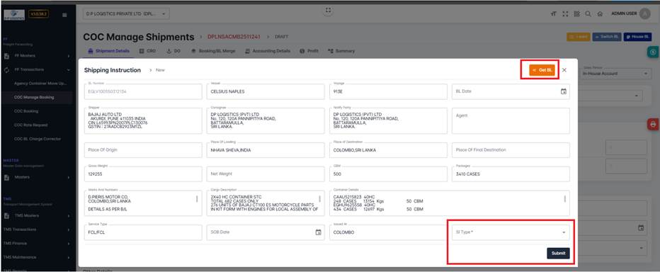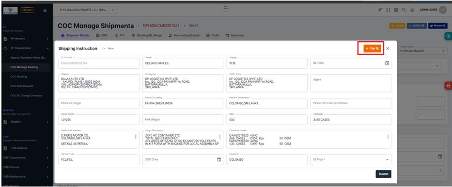 Click Get BL to fetch BL-linked details.