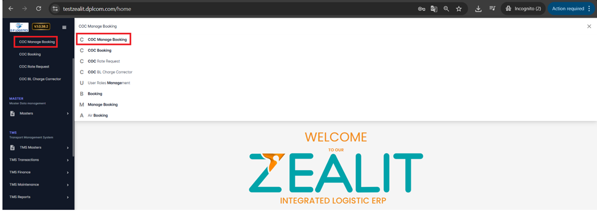 Navigate to COC Manage Booking using the dashboard or the Type to Search bar.