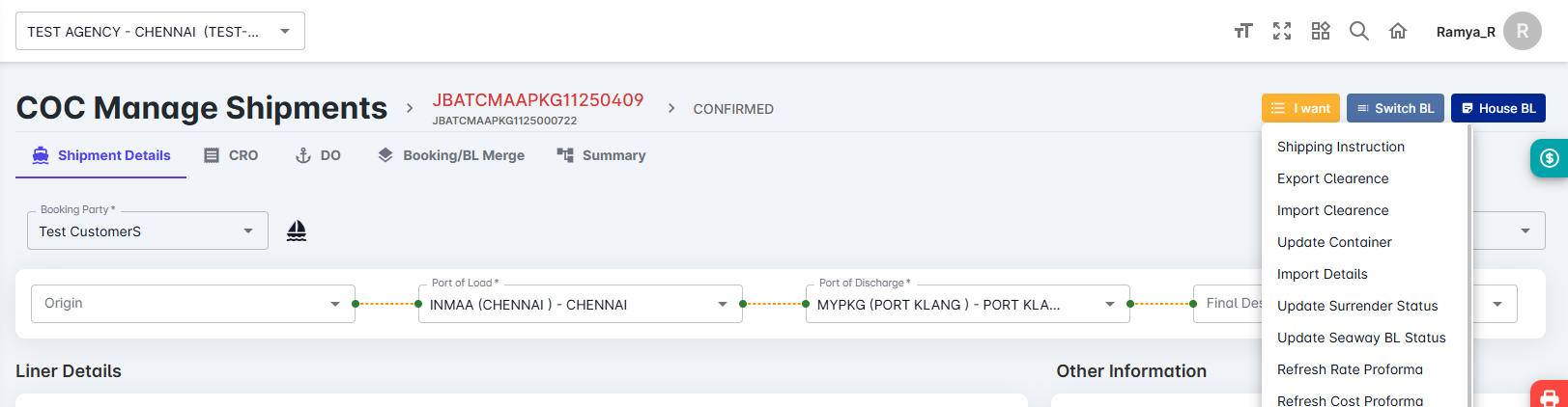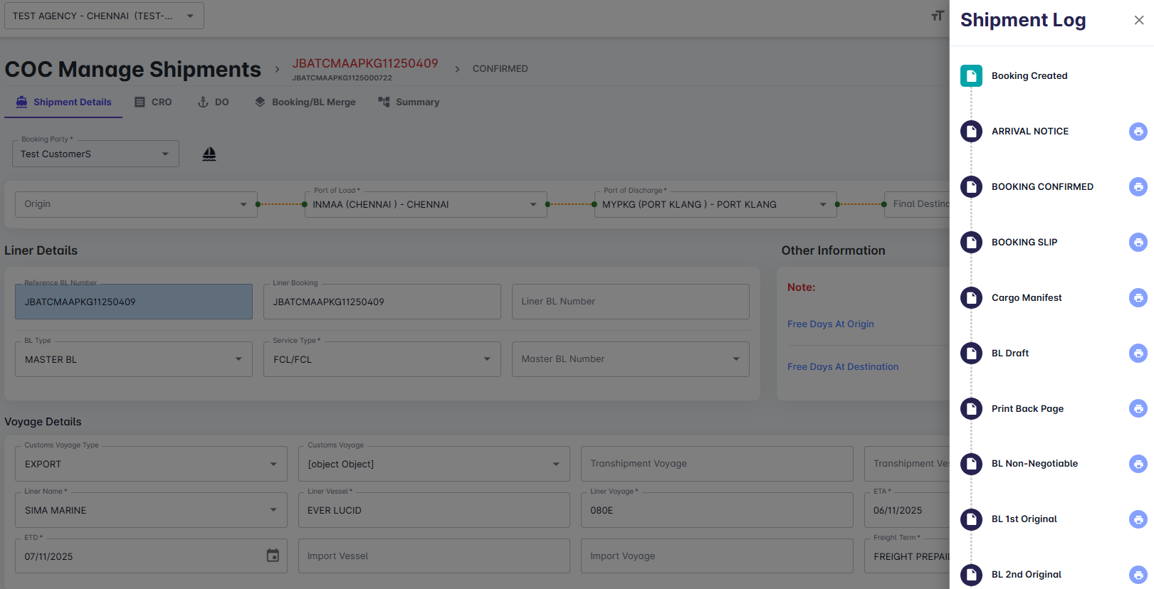 Users can update voyage and cargo details, create Container Release Orders (CRO), manage rates and costs, and generate Bill of Lading (BL) drafts and final prints — all within a single workflow.