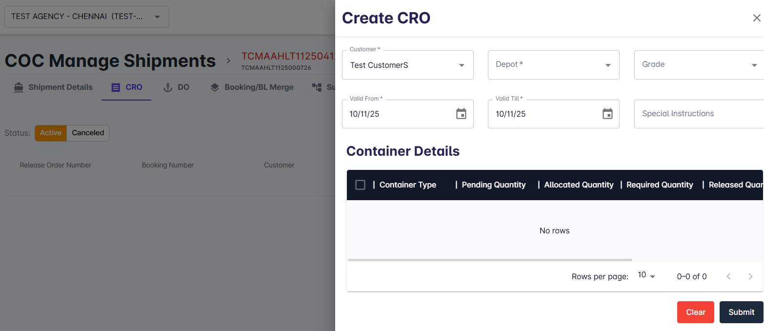 | CRO not generating | Ensure containers and depot are selected before submission. |