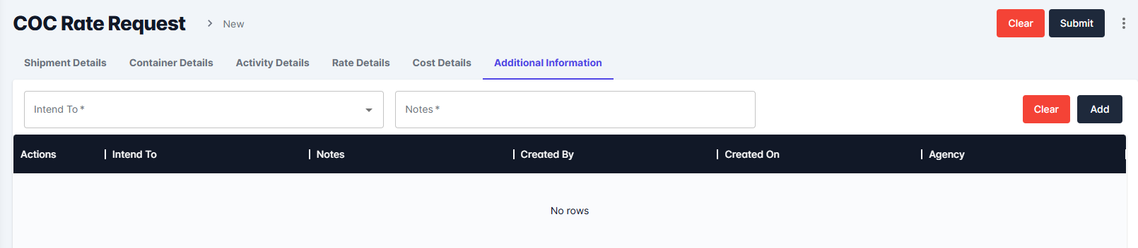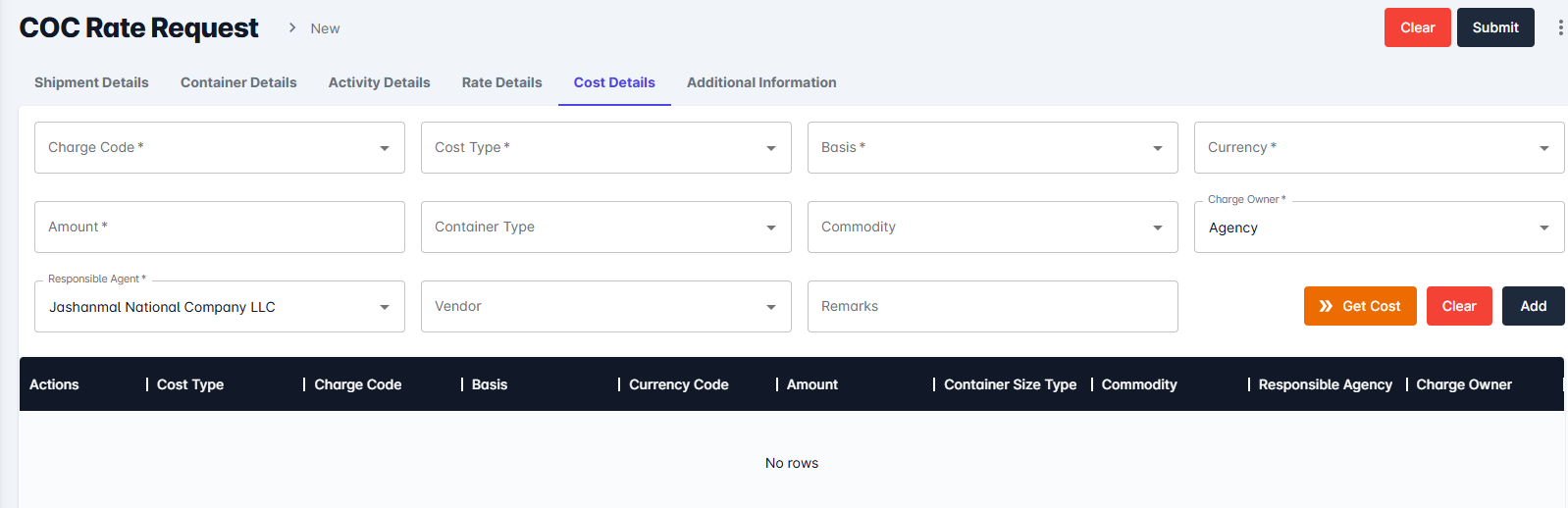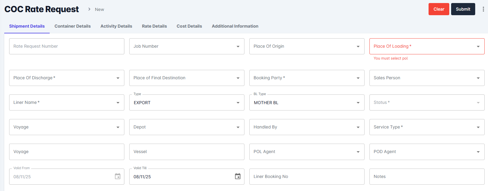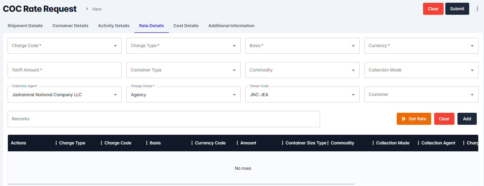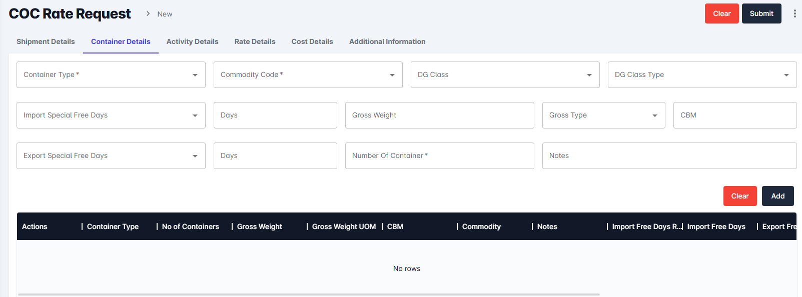 The COC Rate Request module is used to submit quotations for containerized freight forwarding operations. It allows users to define shipment details, container types, and applicable rates and costs for each transaction, with optional profitability visibility for decision-making.