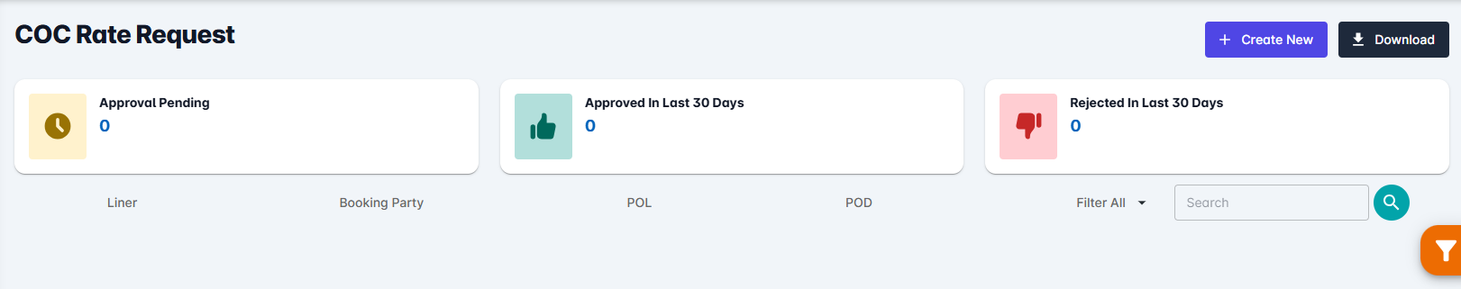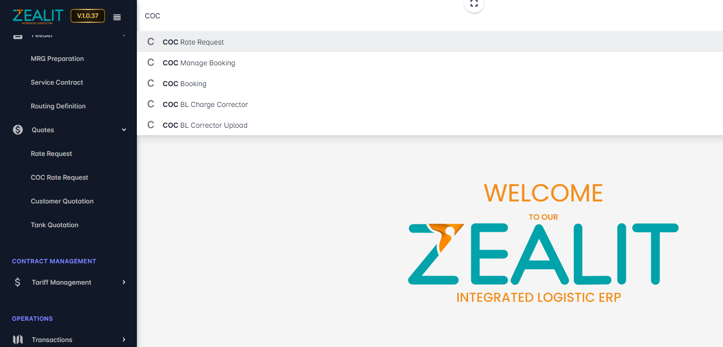 The COC Rate Request module in Zealit 2.0 allows users to file a quotation for freight forwarding operations against a specific Booking Party for a defined combination of port pair, commodity, and product type.