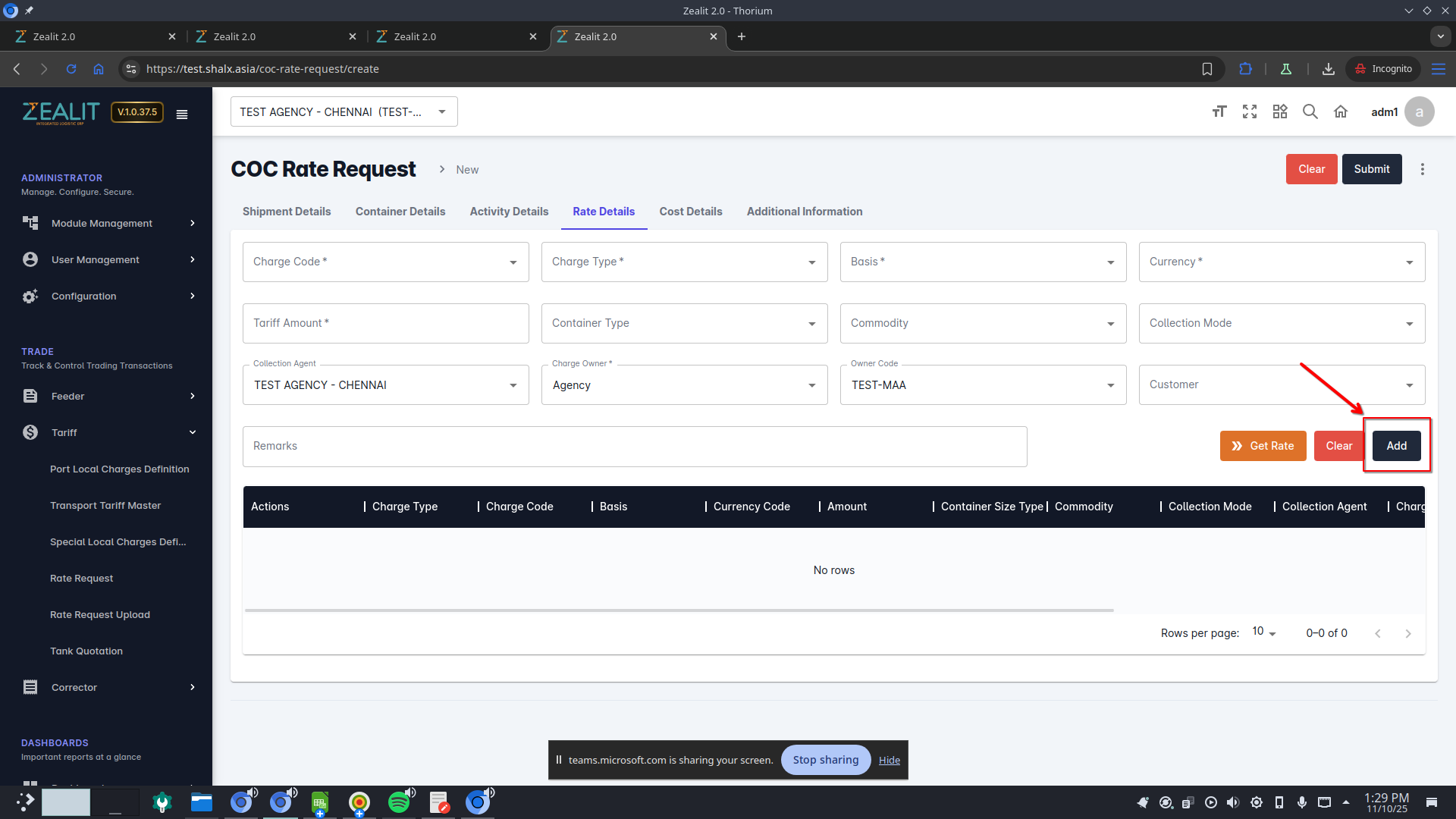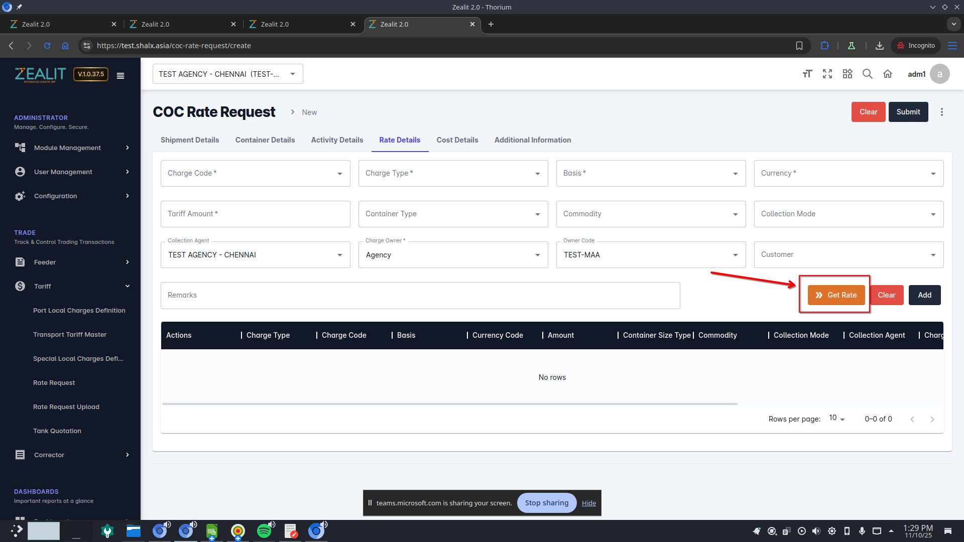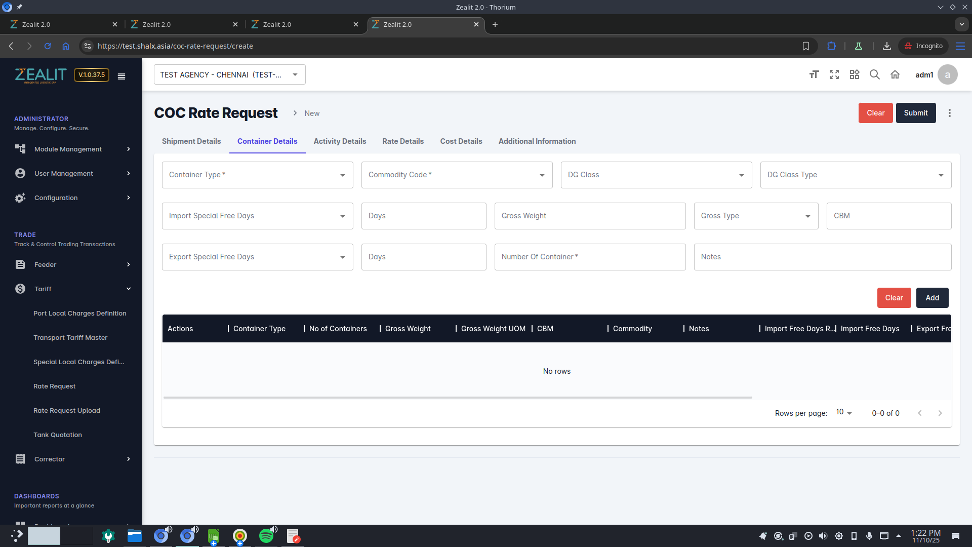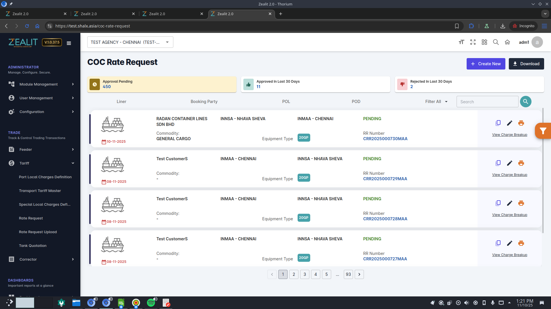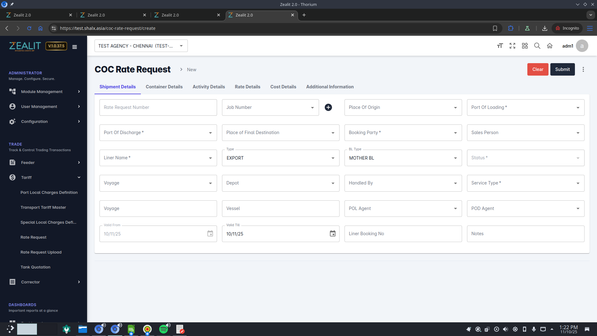 The COC Rate Request module in Zealit 2.0 allows users to file a quotation for freight forwarding operations against a specific Booking Party for a defined combination of port pair, commodity, and product type.