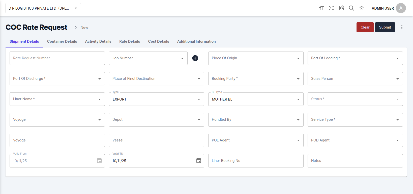 The COC Rate Request module is used to submit quotations for containerized freight forwarding operations.