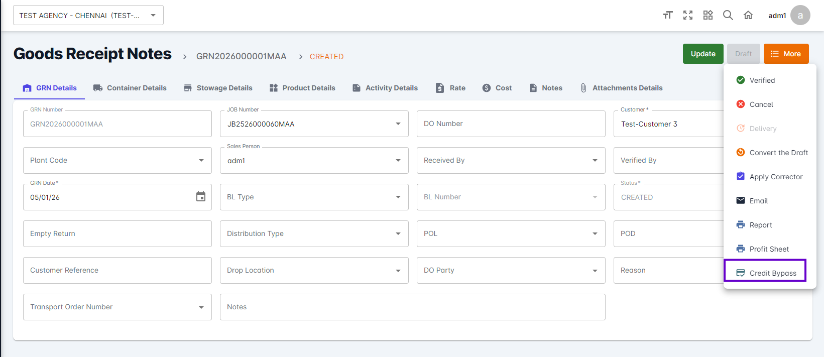 - Under the “More” menu in the GRN, select Credit Bypass.