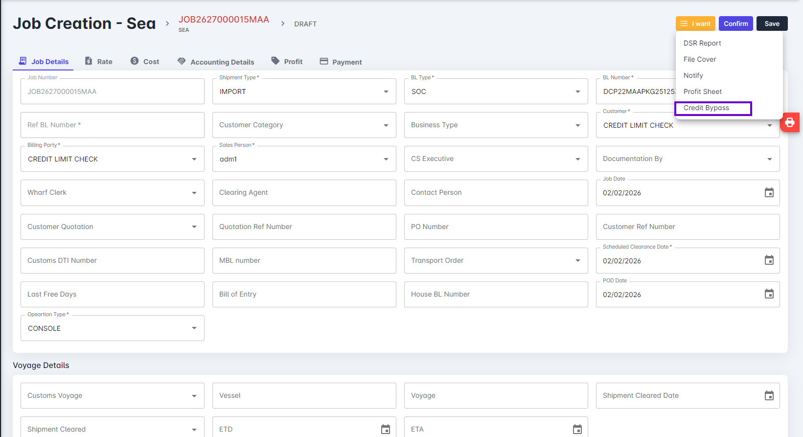 - Under the “I Want” menu in the JOB, select Credit Bypass.