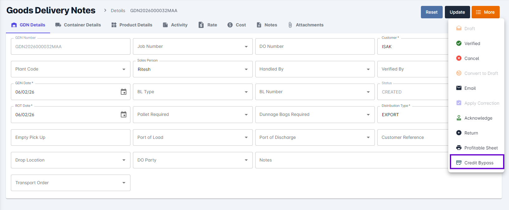 - Under the “More” menu in the GDN, select Credit Bypass.