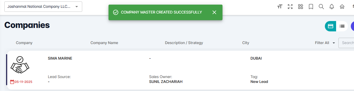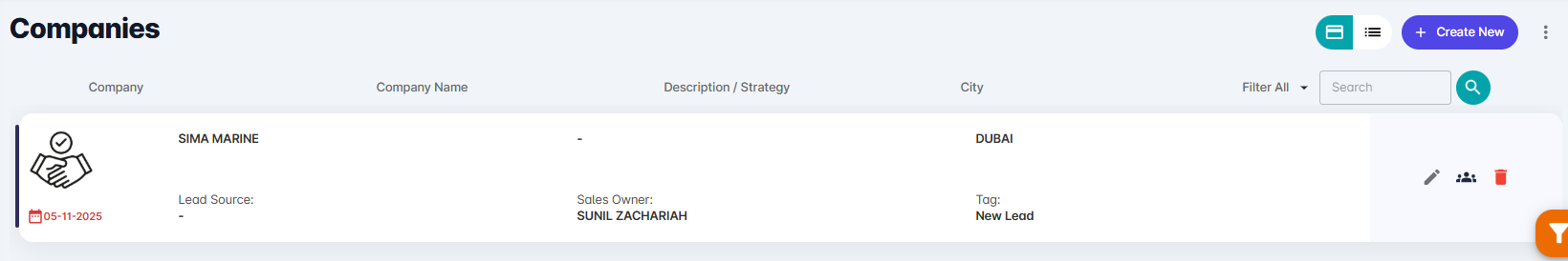 The Company Master module is used to create and manage company (lead or customer) information in the CRM.