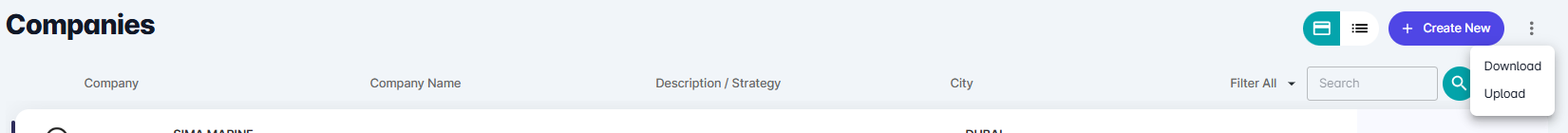 | Upload / Download | Use β¬οΈ Upload to import bulk company data, or β¬οΈ Download to export existing list in Excel |