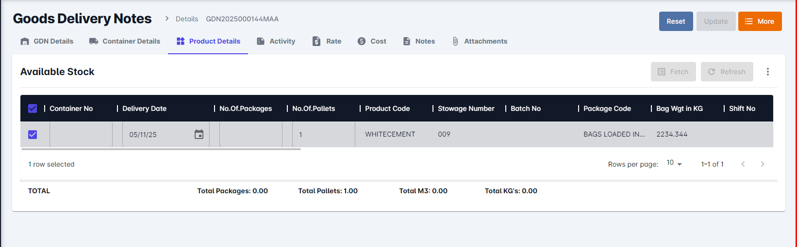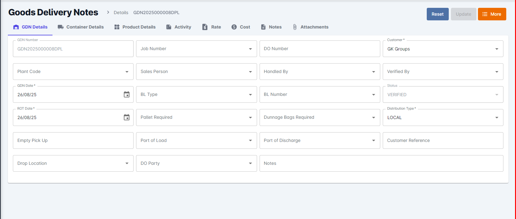 Select the job under which the outbound movement is being processed. Links the GDN to a specific operational job.