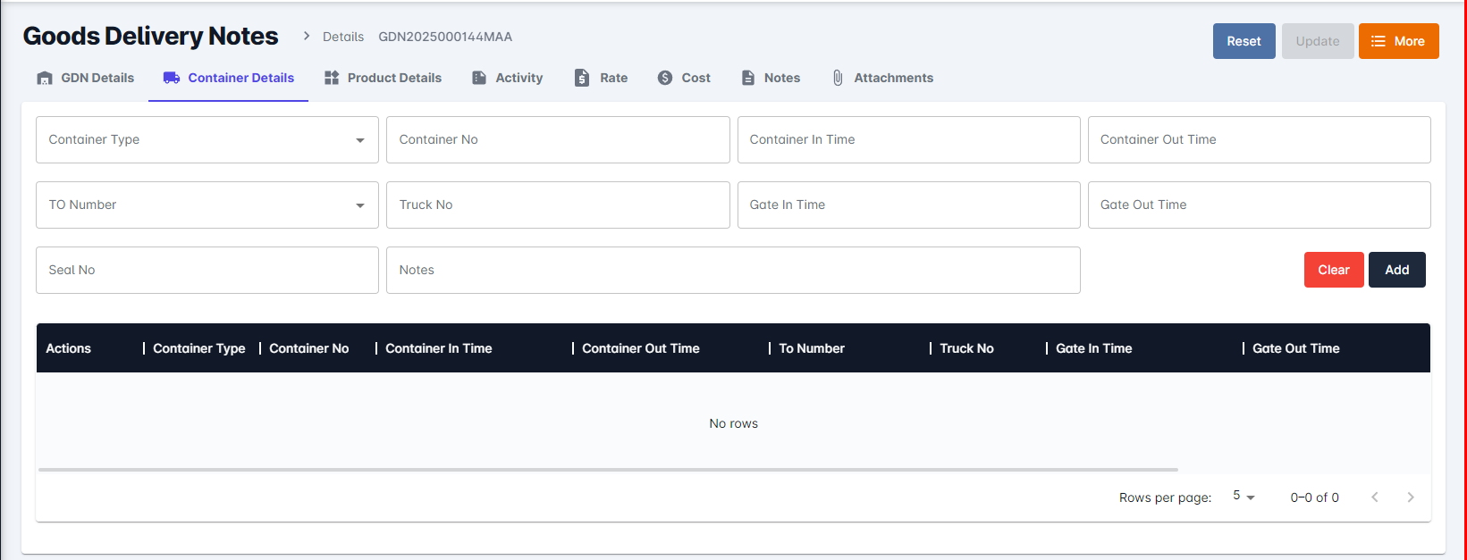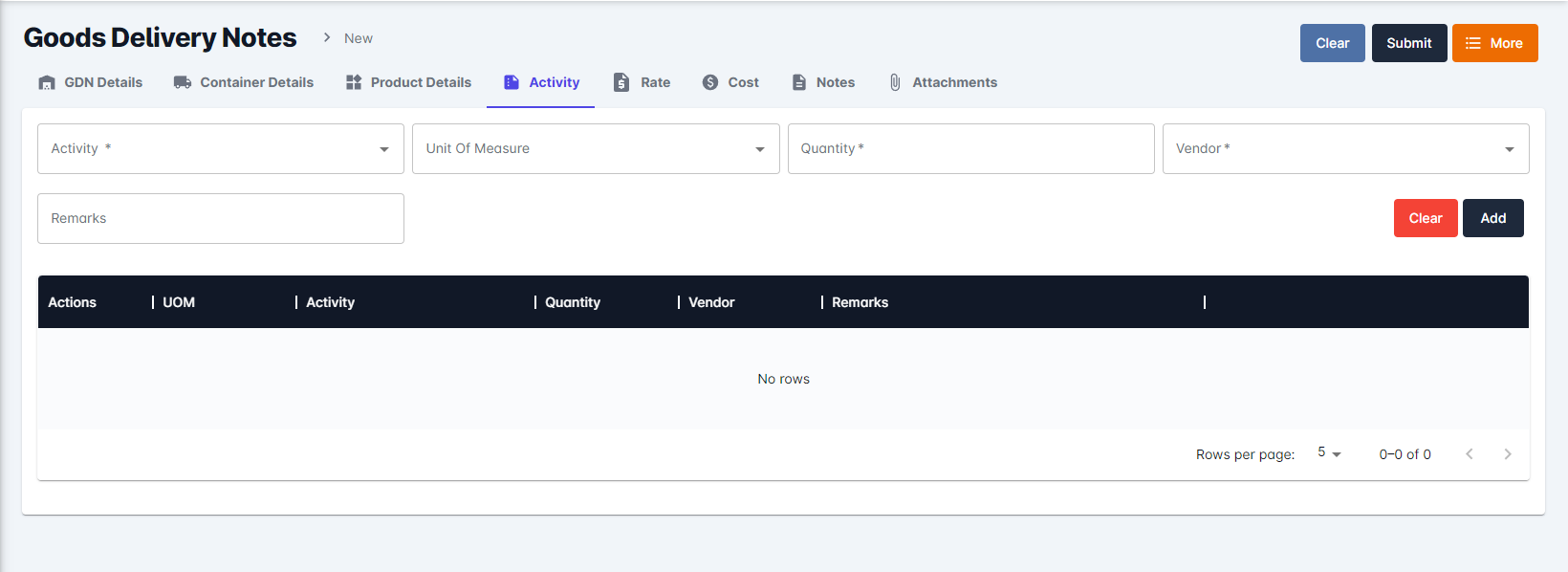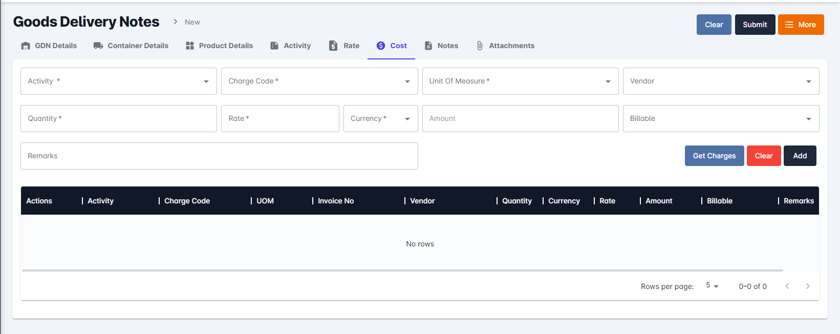 It helps users manage container movements, product withdrawals, activity charges, customer billing, and supporting documents through a streamlined workflow.