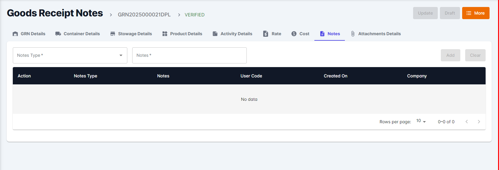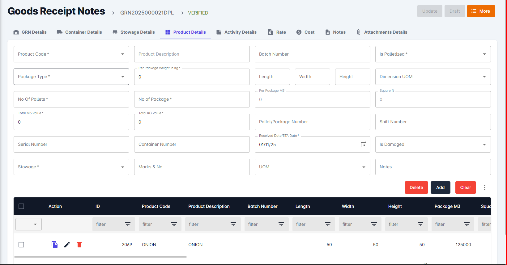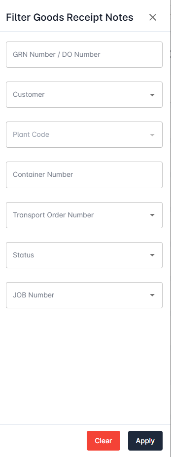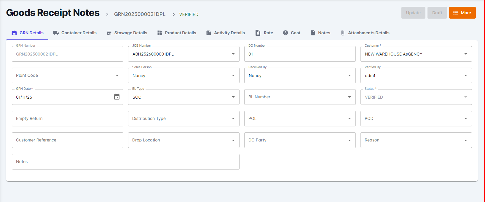 The Goods Receipt Notes (GRN) module is used to record all inbound cargo entering the warehouse or yard.