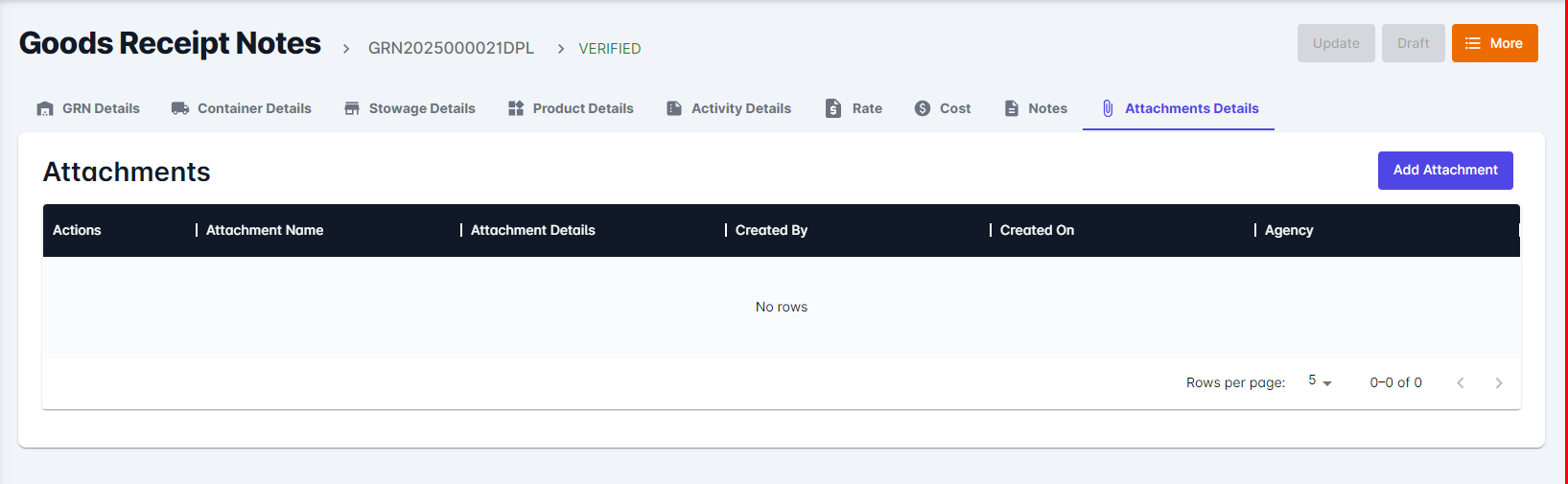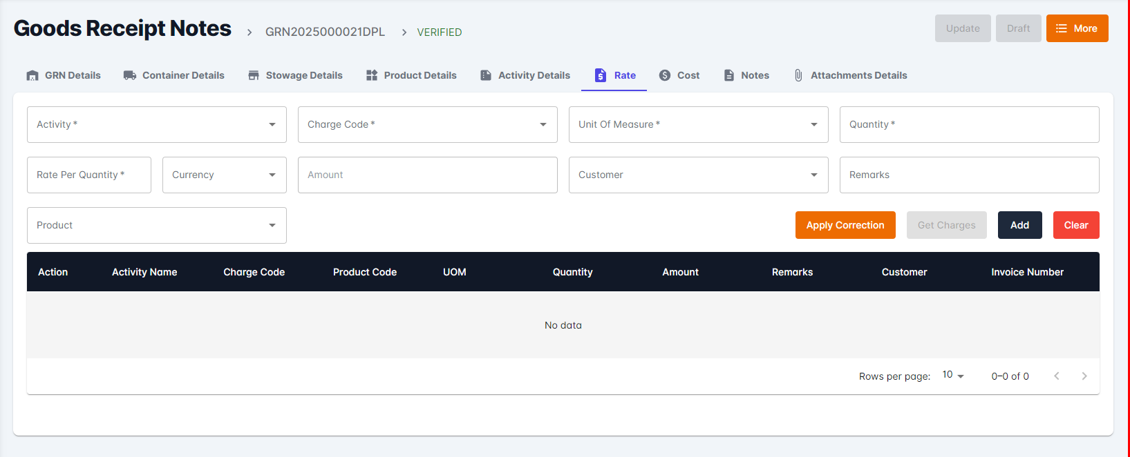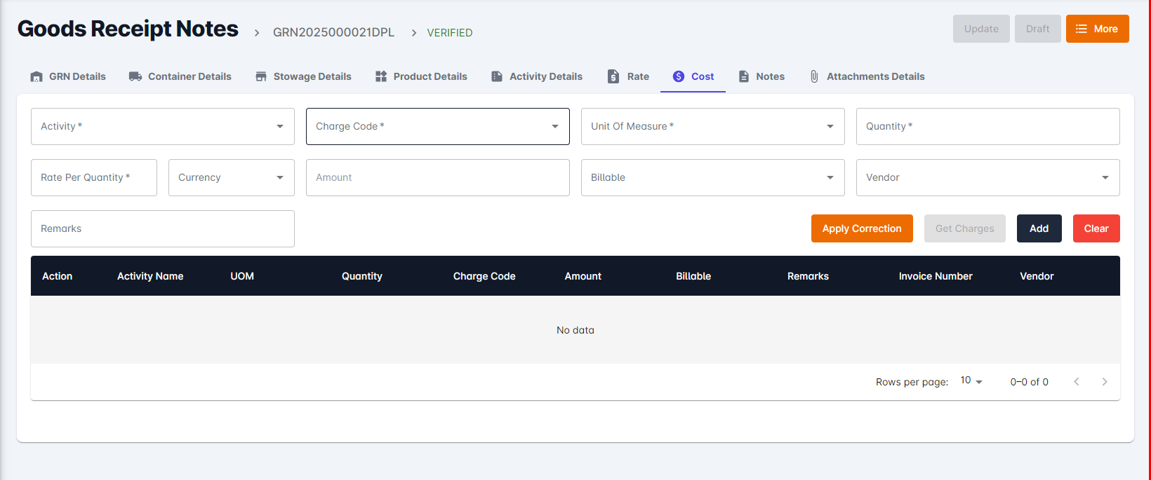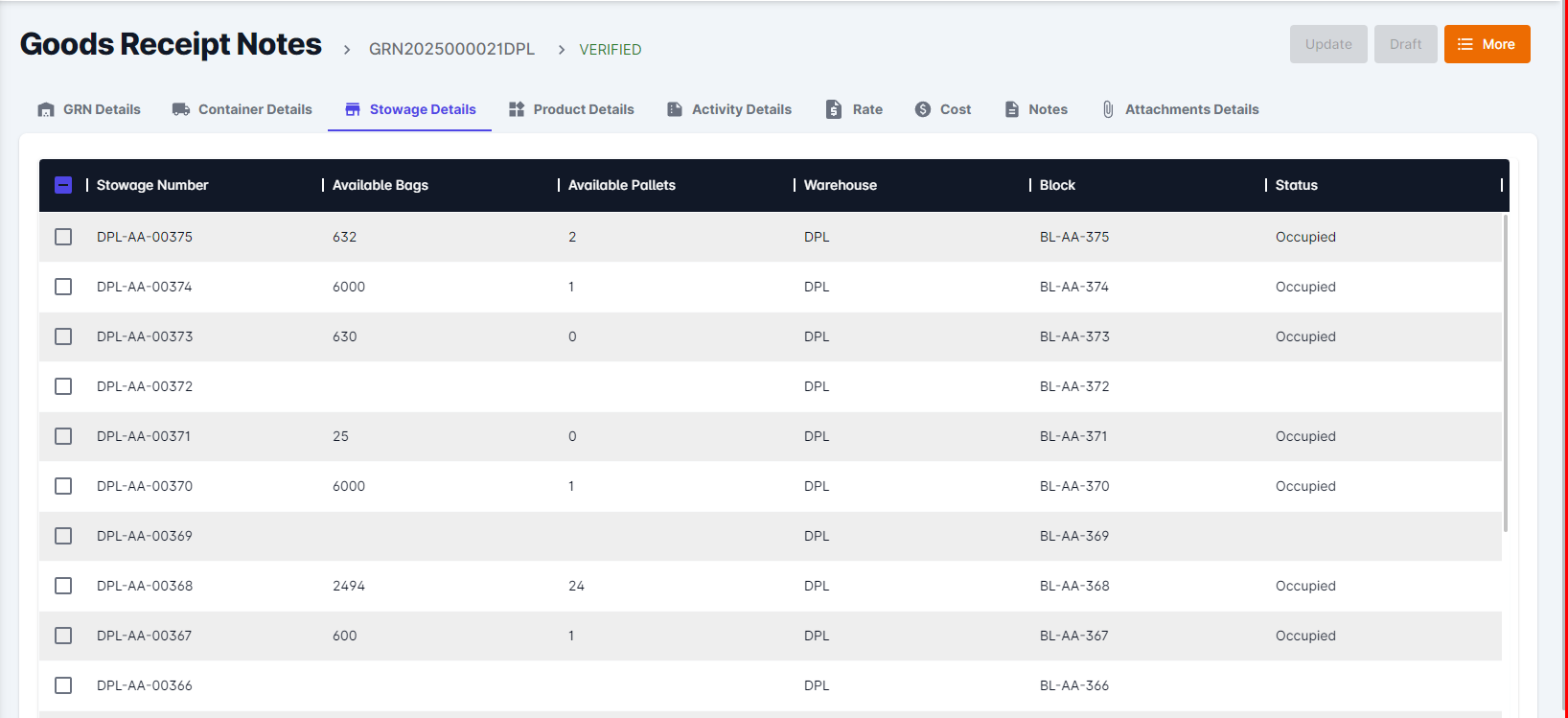 The Goods Receipt Notes (GRN) module is used to record all inbound cargo entering the warehouse or yard.