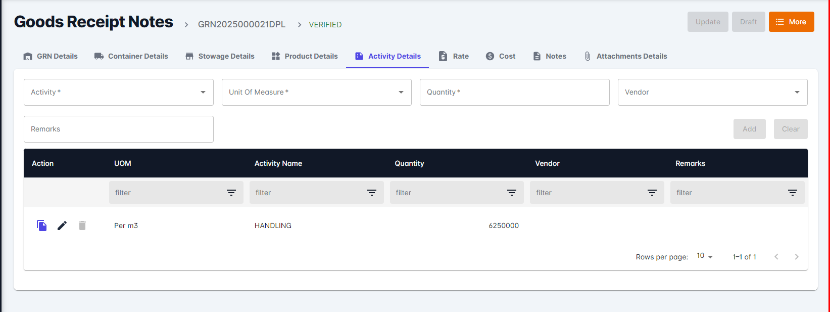 Clicking on the save button will create a new entry for the GRN and will be available at the Validation pending status