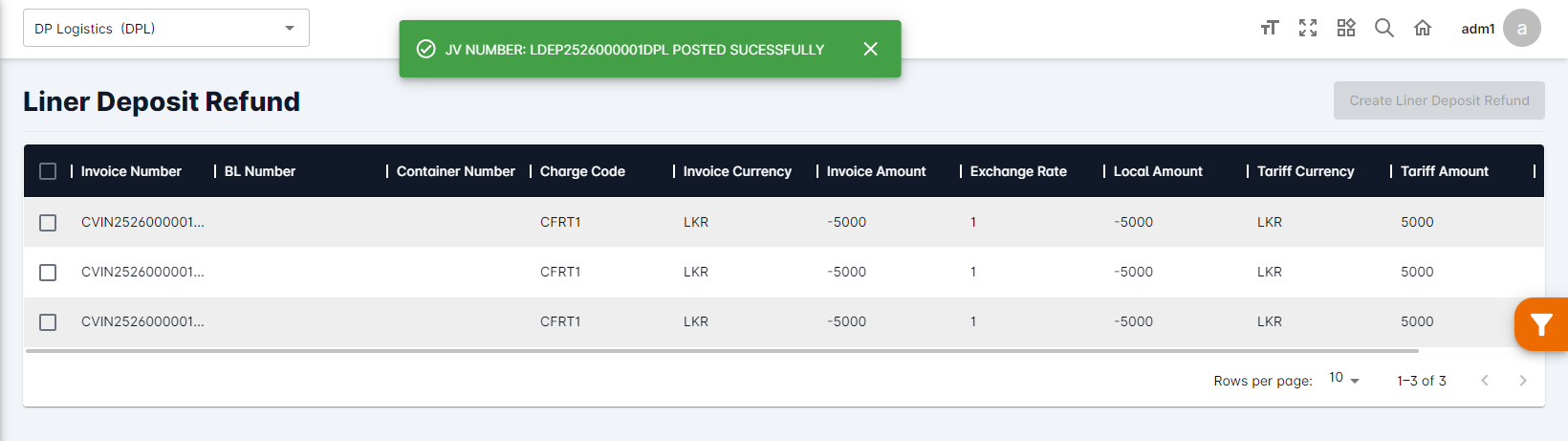 Click “Liner Deposit Refund” to auto-create a Debit Note.