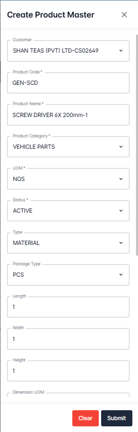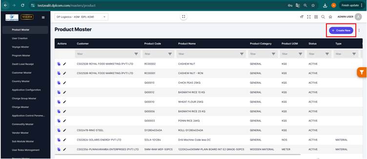 • Use filters (Product Code, Category, Type, UOM, Status) to find specific