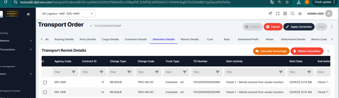 on the detention (vehicle hold) duration recorded in the Transport Order.