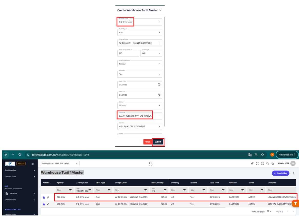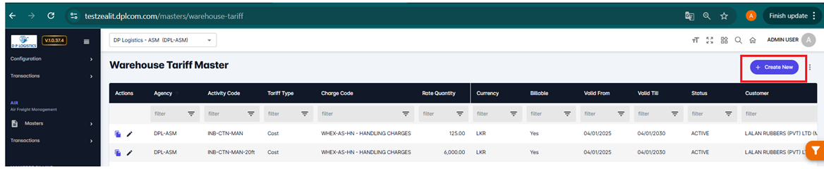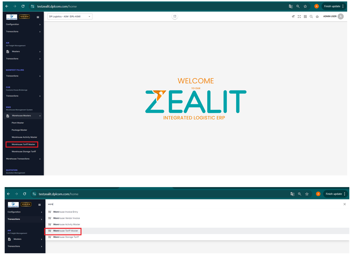 • Step 1: Navigate to the Warehouse Tariff Master Screen