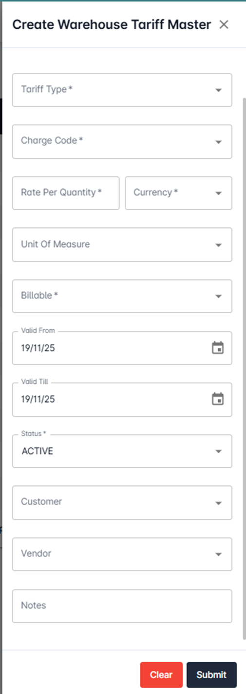 The Warehouse Tariff Master module helps users define, manage, and maintain tariff structures for warehouse operations. It ensures correct and consistent pricing is applied for customers and vendors based on agreed terms.
