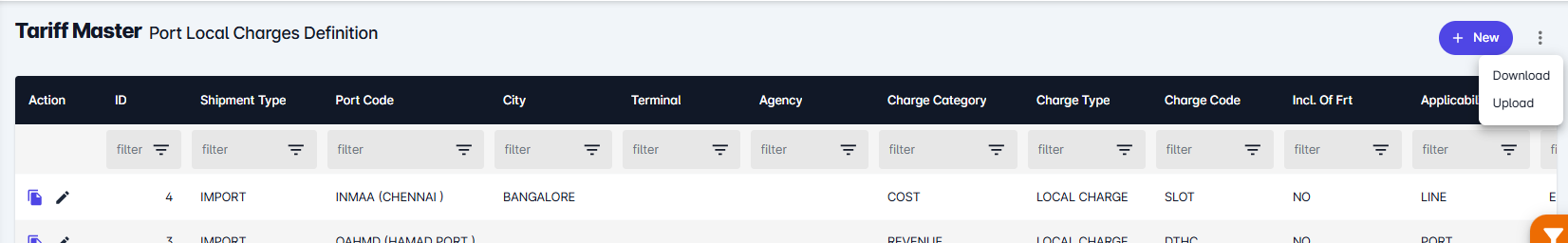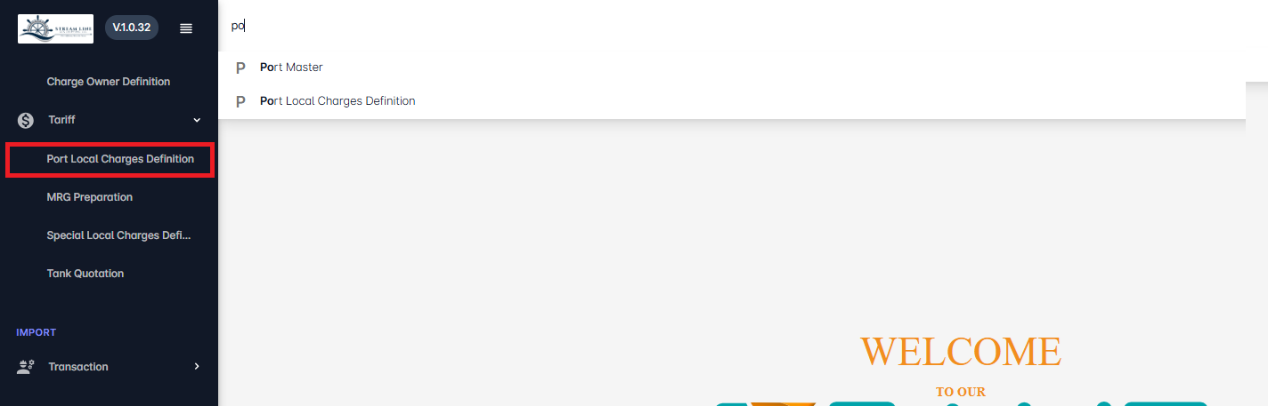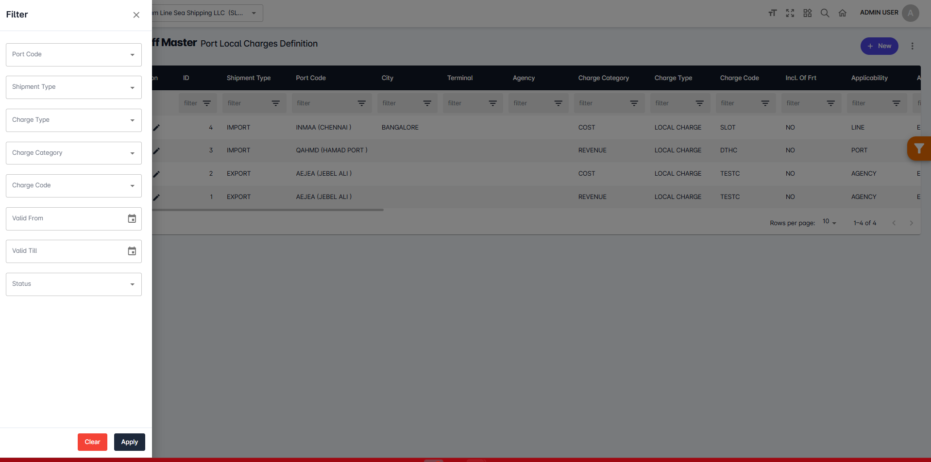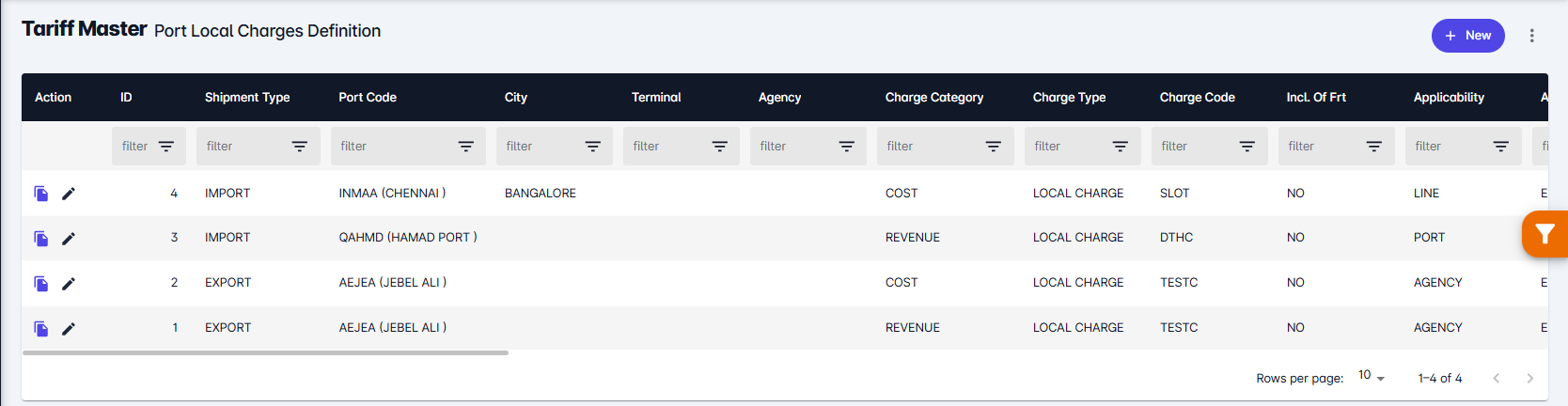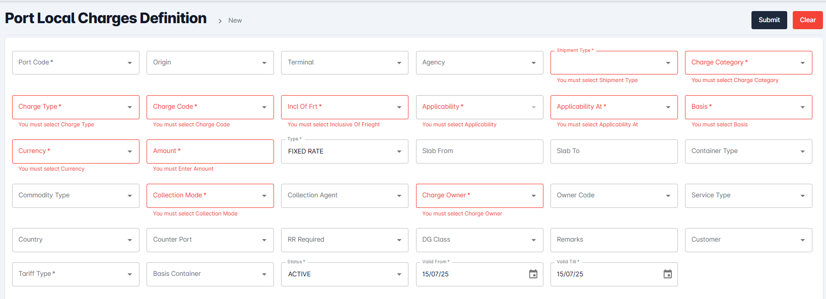 The Port Local Charges module allows users to configure port-related charges that apply to shipments based on specific criteria such as shipment type, charge type, container type, and more. These charges are used automatically during the Rate Request (RR) process.